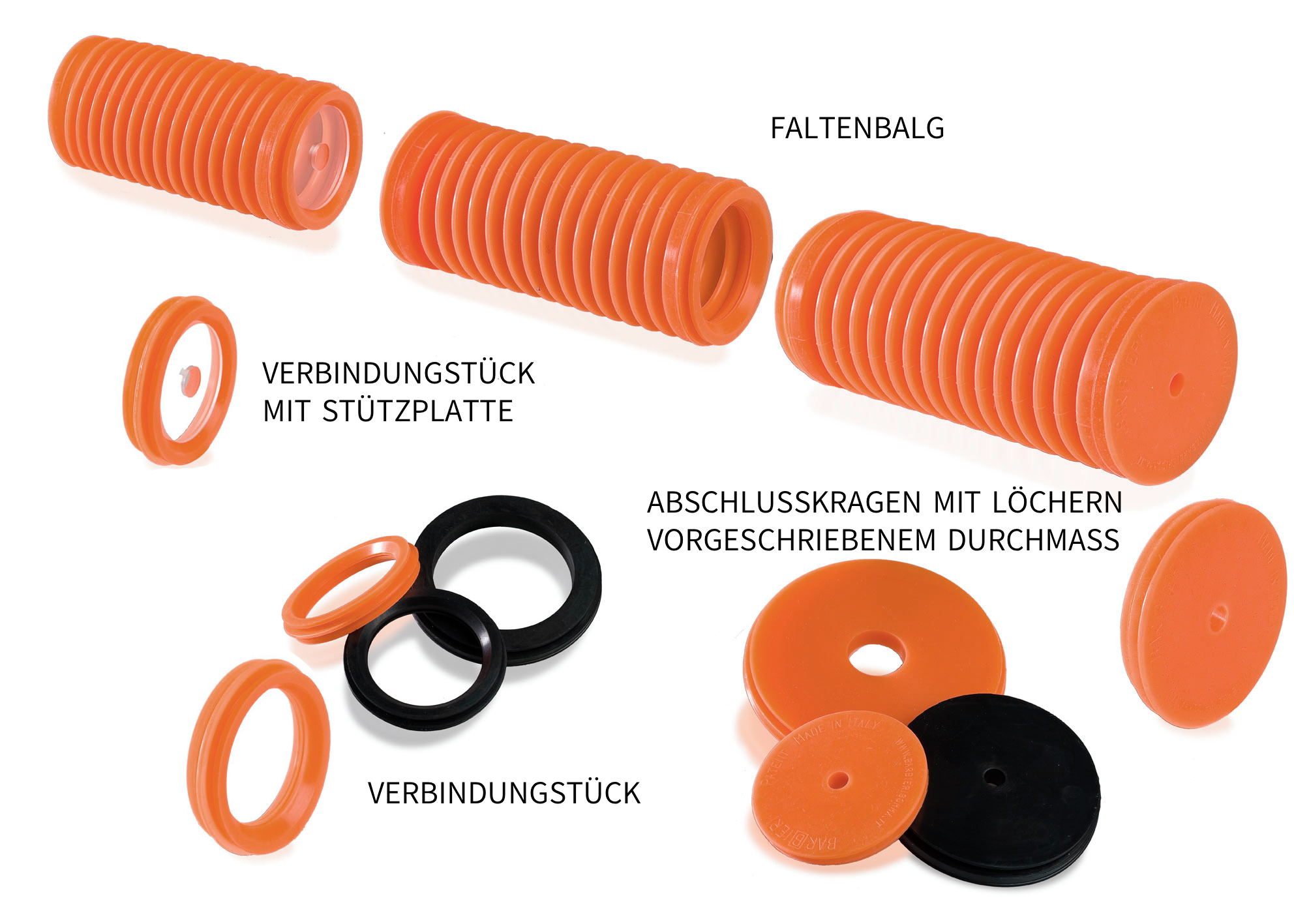 Die modulare Faltenbälge bestehen aus drei Grundelementen: dem Faltenbalg, dem Abschlusskragen und dem Verbindungsstück.